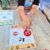 במשחק 25 לוחות משחק ו-2 דסקיות. המשחק מתמקד ב: – במיומנויות של הכרת הרצף של שמות האותיות. – העשרת הידע של הילדים באותיות האלף-בית. – תרגול הקשר שבין הצליל הפותח של שם האות לבין האות עצמה (מתבסס על תומכי זיכרון).